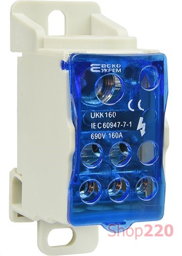 Вход: 1 отв. 10...70 мм кв; выход 1 отв. 6...16 мм кв, 6 отв. 2,5...16 мм кв. Напряжение изоляции 690 В~. Степень защиты IP20.