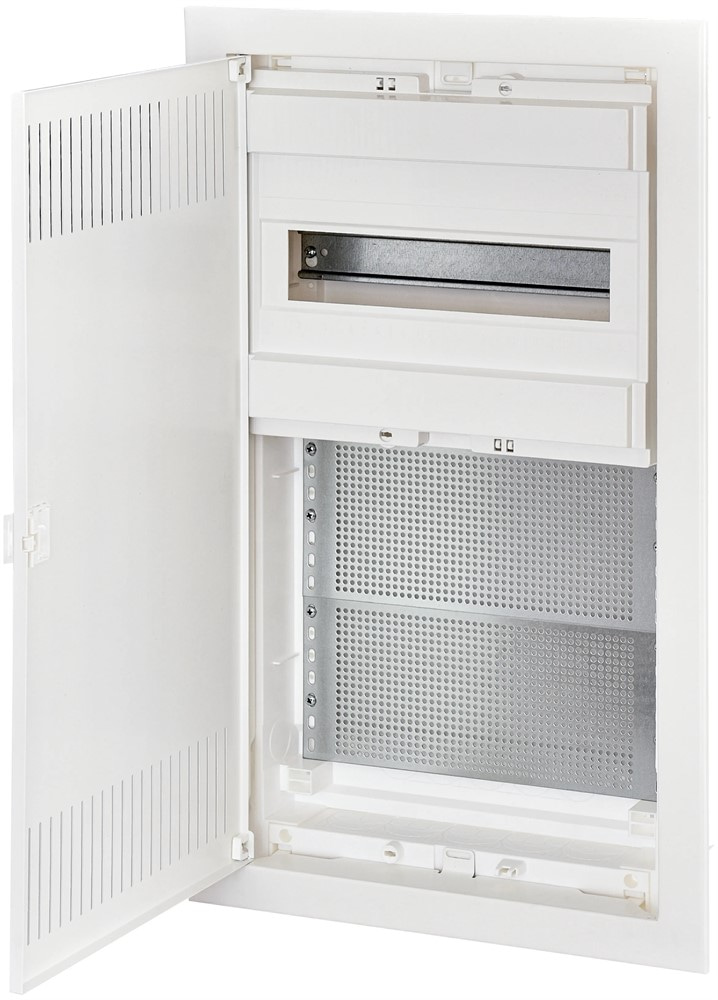 Распределительный щит для слаботочки ETI COMBO2/1-I имеет 2 ряда для установки мультимедийного оборудования, сигнализации, элементов системы "Умный дом" и 12+2 модулей для установки модульного оборудования. Внутренний корпус щита выполнен из пластика, дверца - металлическая с перфорацией для естественной циркуляции воздуха.