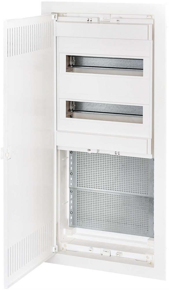 Распределительный щит для слаботочки ETI ECG 56 COMBO2/3-I имеет 2 ряда для установки мультимедийного оборудования, сигнализации, элементов системы "Умный дом" и 24+4 модуля для модульного оборудования. Внутренний корпус щита выполнен из пластика, дверца - металлическая с перфорацией для естественной циркуляции воздуха.
