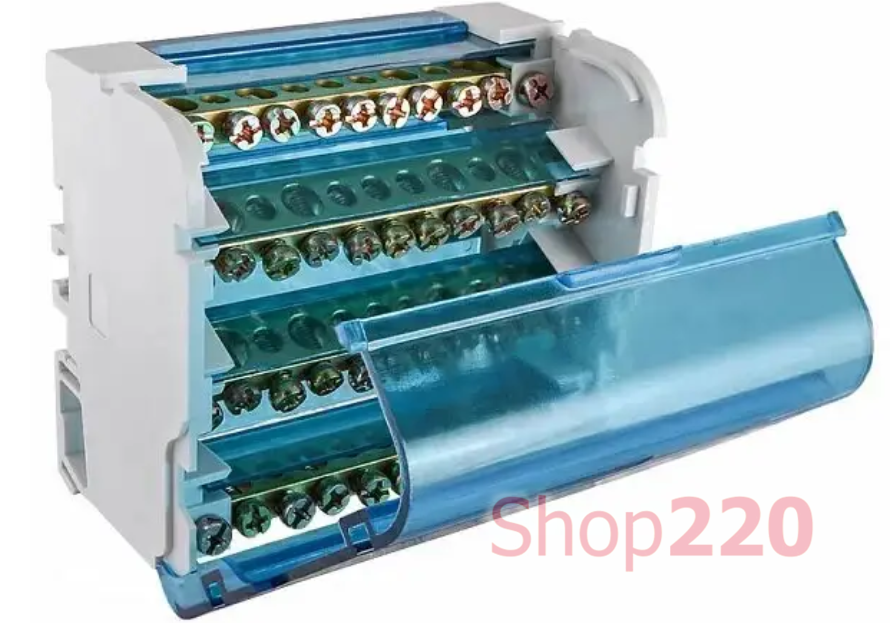 Сечение присоединяемого провода, мм²: с наконечником — 1,5-6,0*7, 6-16*2, 10-16*2; без наконечника — 2,5-6*7, 10-25*2, 10-35*2. Вводы: 11. Материал: самозатухающий пластик. Количество шин — 4. Ширина блока 100мм.