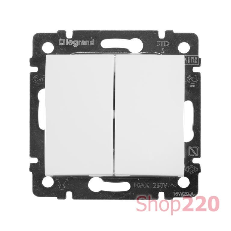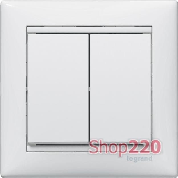 774405 Legrand Valena Выключатель двухклавишный (2- клавишный) белого цвета предназначен для управления освещением двух независимых источников света или двух частей одной люстры. Он состоит из двух компонентов: механизм + рамка (заказывается отдельно). Поверхность Legrand Valena выполнена из термопласта - ударопрочного, не ломающегося материала, стойкого к ультрафиолетовому излучению.