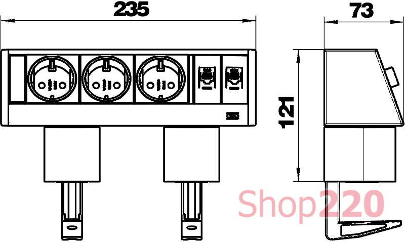 Накладной угловой блок розеток OBO Bettermann имеет 3 электрических розетки немецкого стандарта (Schuko) с защитными шторками и два компьютерных разъема RJ45 категории 6. Монтируется на столешницу с помощью зажимов. Толщина столешницы от 8мм до 40мм. Кабельный вывод расположен с нижней стороны блока. Корпус блока сделан из прочного и легкого алюминия и пластика. Стильный угловой розеточный блок впишется практически в любой современный интерьер.